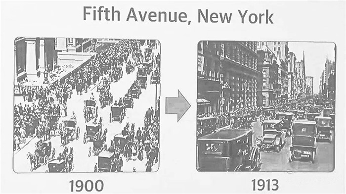 這是美國(guó)紐約的第五大道,左邊那張是1900年的,你看到一輛汽車,和九十九匹馬車。而右邊的,同樣的地方,13年后,你看到的是九十九輛車,和一匹馬車。