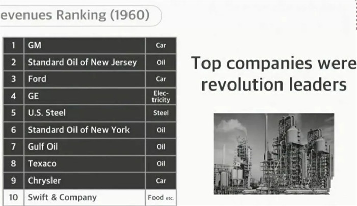 換句話說(shuō),1960年全世界最大的公司基本上是兩類:汽車和能源。在那個(gè)年代,投資這兩類公司,你就投資了未來(lái)。