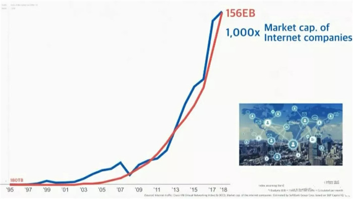 這是全球網(wǎng)絡(luò)的流量,橫坐標(biāo)是年份。紅色的線代表流量。從最早的1995年到2018年,網(wǎng)絡(luò)的流量,增加了100萬(wàn)倍。我們?cè)賮?lái)看另一條藍(lán)色的線。藍(lán)色的線,表現(xiàn)的是23年來(lái)全球互聯(lián)網(wǎng)公司的市場(chǎng)價(jià)值(市值)。