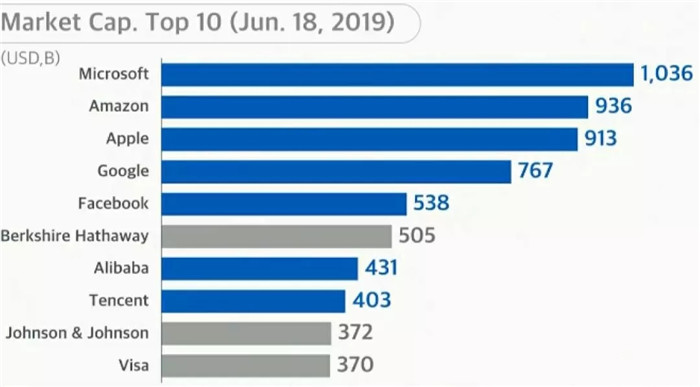 而今天,2019年市值十大的公司:微軟、亞馬遜、蘋(píng)果、谷歌、臉書(shū)、阿里巴巴、騰訊,全都是網(wǎng)絡(luò)公司。全世界市值十大的公司里,有七家是網(wǎng)絡(luò)公司。