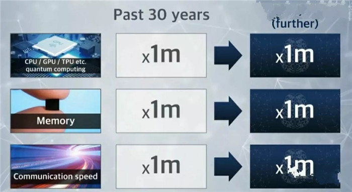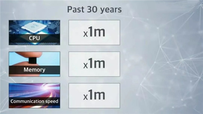 各位,處理器的運(yùn)算能力,記憶體的儲(chǔ)存能力,互聯(lián)網(wǎng)的傳輸能力,在這30年來(lái),都成長(zhǎng)了100萬(wàn)倍。30年來(lái),成長(zhǎng)的幅度是這樣,那再過(guò)30年呢?