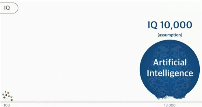 30年后,AI的智商將會(huì)是10000。你們有誰(shuí)聽(tīng)過(guò)哪個(gè)人的智商是10000的?人不可能,但是“人工智能”可能。一萬(wàn)智商的AI,再天才的人都沒(méi)法比。