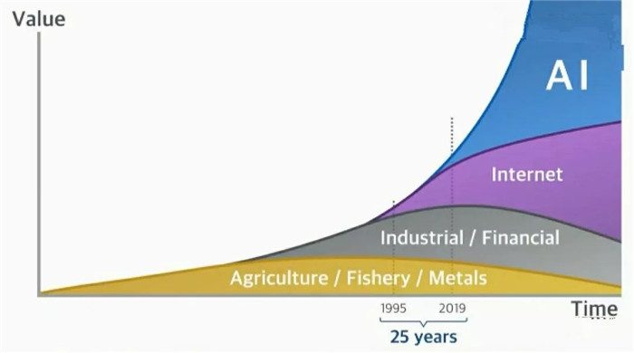 豎軸代表價(jià)值,橫軸代表時(shí)間,底部的黃色,代表農(nóng)業(yè),其價(jià)值與時(shí)間的比例一目了然;灰色代表工業(yè),紫色代表互聯(lián)網(wǎng),也就是我們正處的時(shí)代;而未來(lái)最有價(jià)值的東西,是屬于藍(lán)色的,是屬于AI的。